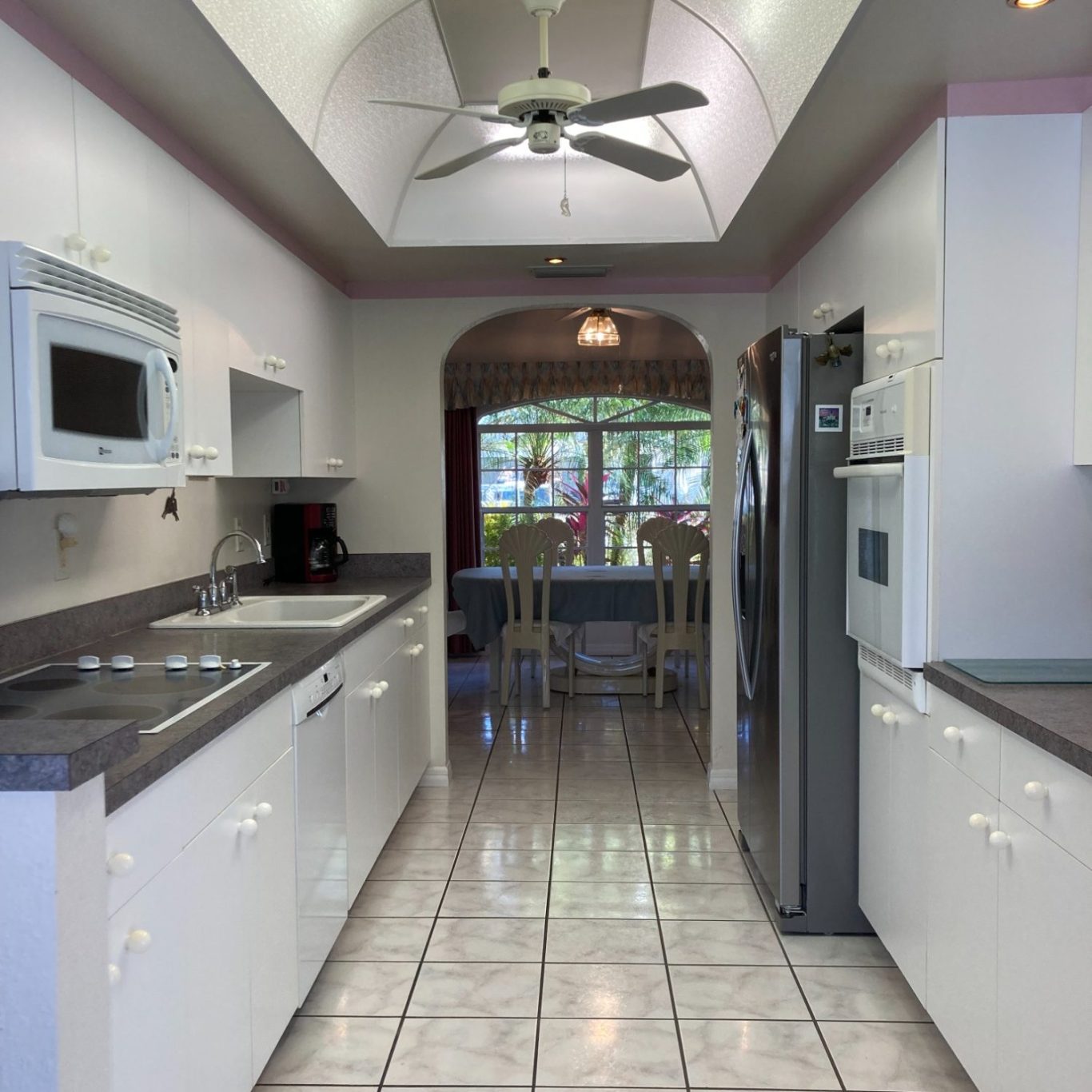 Küche: Die voll ausgestattete Küche lässt keine Wünsche offen. Zur Ausstattung gehören ein Einbauherd mit Ceranfeld, Mikrowelle, Geschirrspüler sowie ein großer Kühl-Gefrierschrank mit Eiswürfelbereiter. Etliche Kleingeräte wie Kaffeemaschine, Toaster, Wasserkocher, Zitruspresse und ein praktischer Speiserestezerhacker in der Spüle erleichtern die tägliche Arbeit.
